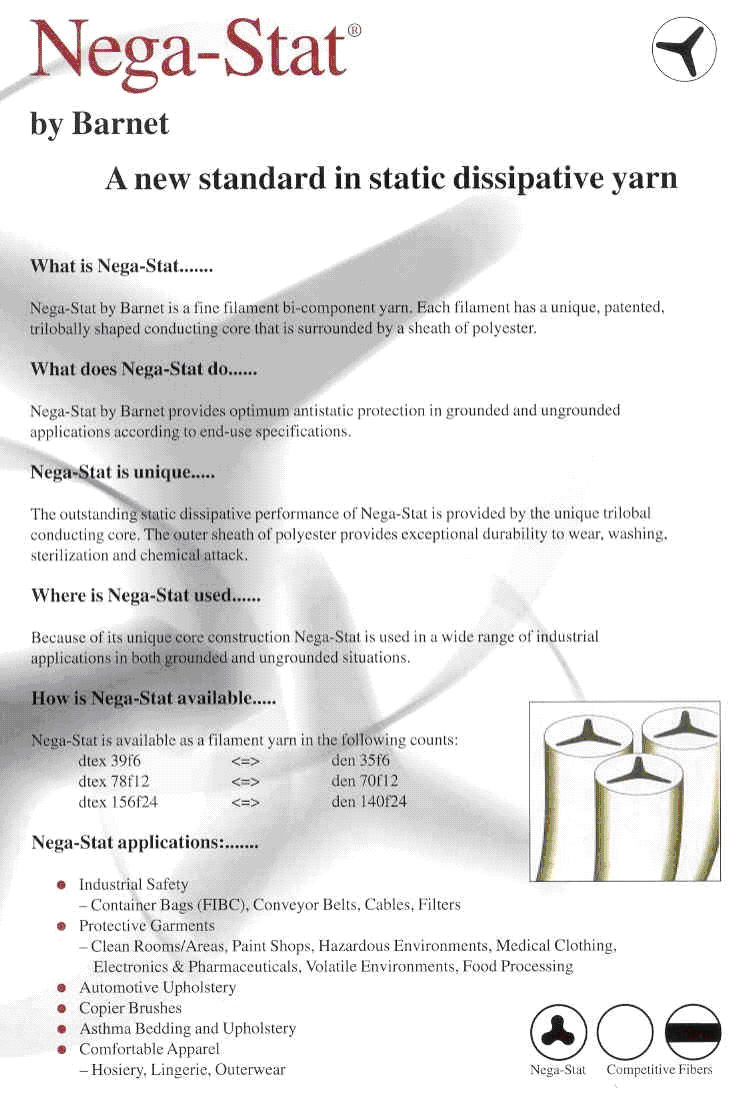 While other anti-static fabrics work by conducting electric charges along the surface, NEGA-STAT® fabrics work by inducing charges into the unique encapsulated conductive carbon core.