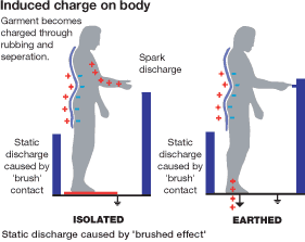 The static-dissipative NEGA-STAT® fibres are adjacent to standard non-conductive yarns. If the fabric is charged to a (+) polarity by rubbing something against it, the (+) charges on both the conductive fibres and the non-conductive fibres induce electrons into the conductive core. This behavior is called charge induction and creates two effects, which combine to give NEGA-STAT® fabrics their excellent static control performance.