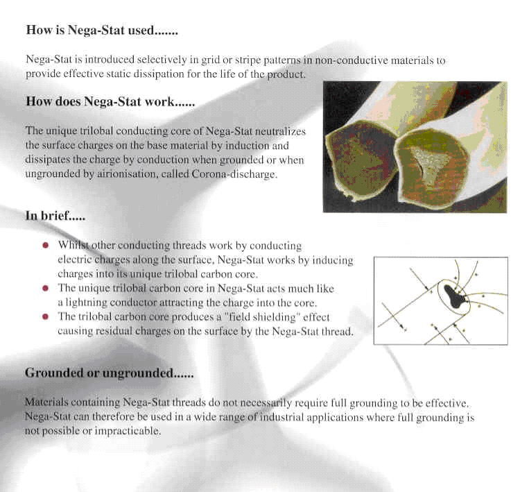 While other anti-static fabrics work by conducting electric charges along the surface, NEGA-STAT® fabrics work by inducing charges into the unique encapsulated conductive carbon core.